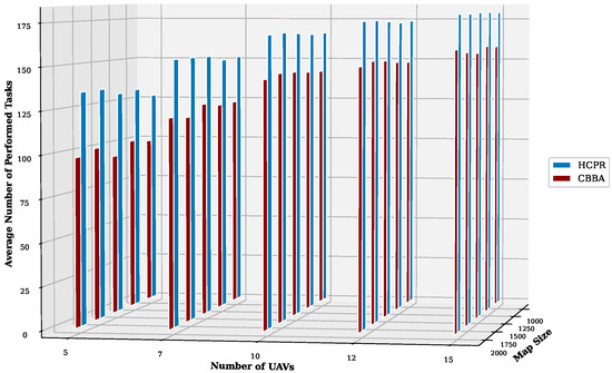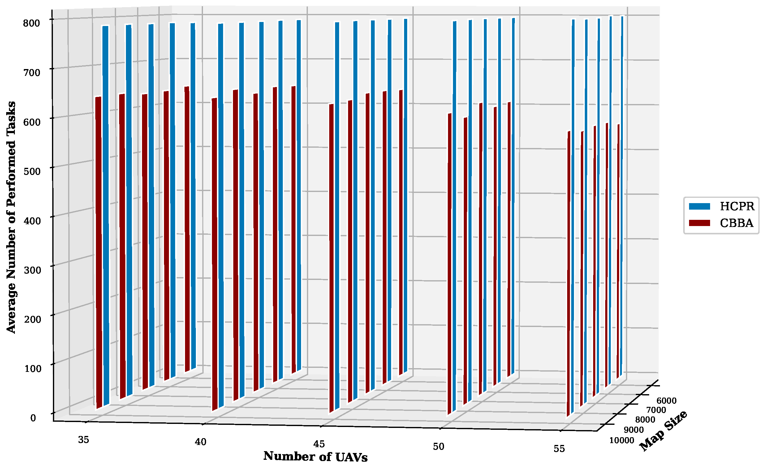 - In contrast to the CBBA-LR algorithm, which involves all searcher UAVs in reassignment, HCPR selectively engages only a subset of UAVs—those in closest proximity to the new task. This targeted approach reduces the travel distance, thereby enhancing the overall efficiency of the score function.