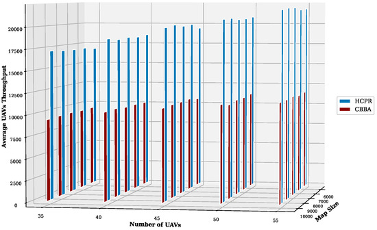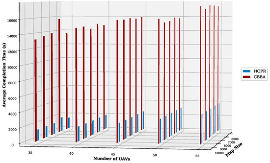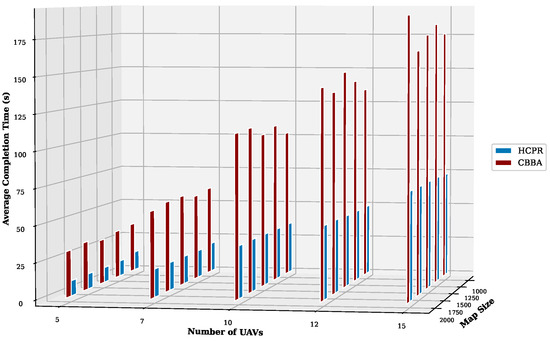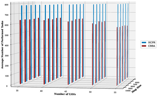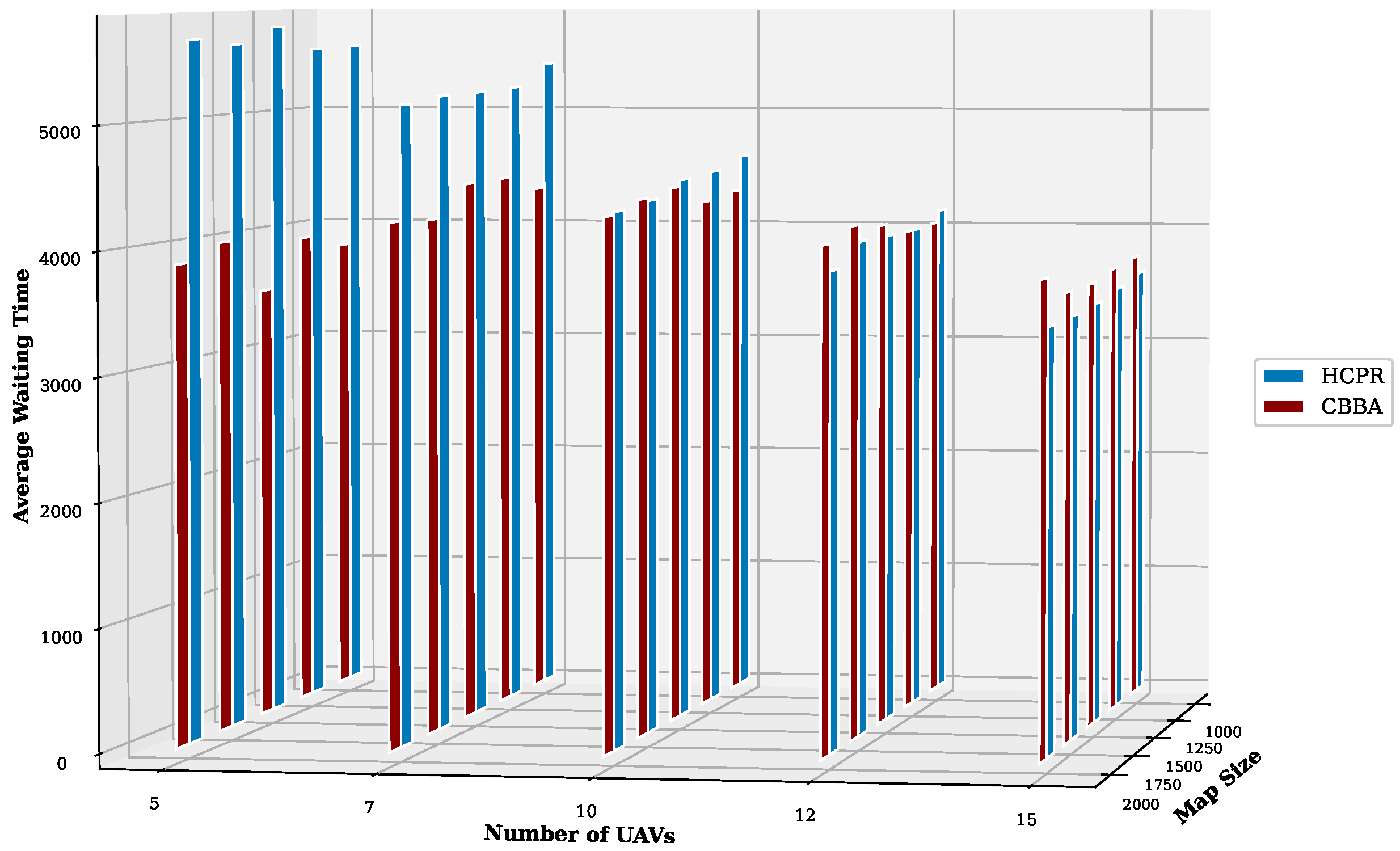 - UAV Failure: The UAVs depart from the base stations at . At , UAV was compromised by an enemy attack and can no longer perform its tasks. The TS-DTA score () after UAV failure was 2051.28, whereas the HCPR score was 1018.