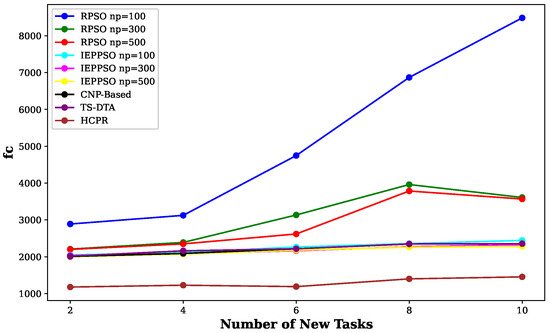 Comparative Analysis of Solution Quality: We conducted a comparative analysis of the HCPR algorithm against TS-DTA [42], CNP-based [43], and two centralized task assignment algorithms, RPSO [48] and IEPPSO [49]. These comparisons were initially based on the occurrence of a single dynamic event—the appearance of a new target. For a more comprehensive analysis, we introduced various numbers of new targets into Experiments 2, 4, 6, 8, and 10. We assessed the performance by evaluating the overall cost of UAV formation () across different scenarios and depicted these variations in a line chart (Figure 20) that illustrates how the overall cost changed with the number of targets allocated. HCPR significantly outperformed the other algorithms in minimizing the function across the various scenarios, consistently achieving the lowest values.