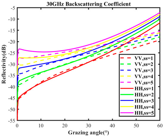 The scatter coefficient is shown in Figure 1 under the conditions of sea states 1 to 5, HH and VV polarizations, and carrier frequency of 30 GHz.