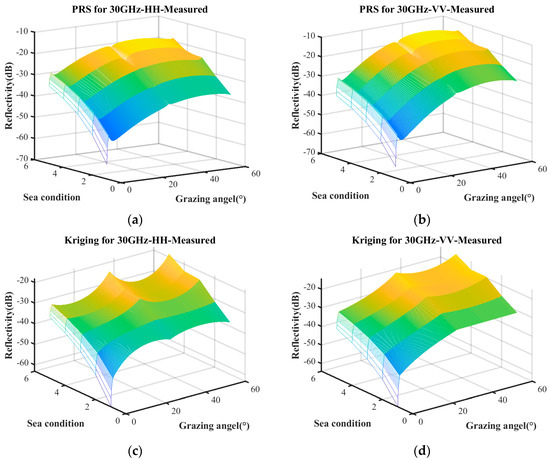 Figure 5 presents the sea clutter characterizations constructed under these three conditions. Figure 5a–d represent the predictive results obtained solely from measured data using the PRS and Kriging model, whereas Figure 5e,f refer to the predictions derived from the combination of the empirical model and measured data. The surface plot illustrates the predictive relationship between reflectivity, grazing angle, and sea conditions. Notably, the characterization based on measured data exhibits significant differences compared to the one incorporating both the empirical model and measured data.