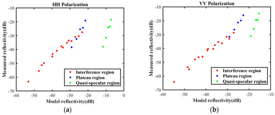 The HH polarization reflectivity and VV polarization reflectivity of measured data and the data predicted by the NRL model are illustrated in Figure 4. All samples are color-coded into three intervals using red, blue, and green, labeled interference region, plateau region, and quasi-specular region, respectively. It is shown that the relationship between the measured data and predicted values across the entire region is not linear, whereas the relationship within each interval is almost linear.