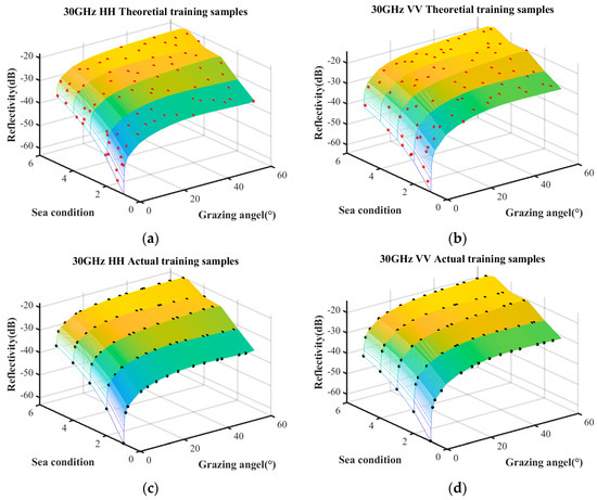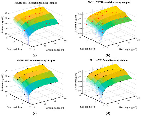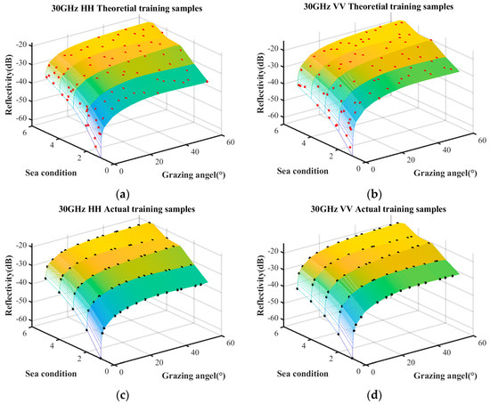 The sample quantities under different coverage rates are discussed first. The trained samples under the condition of a coverage rate of 85%, 90%, and 95% are selected by the surrogate equation based on the combination of measured data and empirical model. The theoretical training samples and the actual training samples are shown in Figure 7, Figure 8 and Figure 9, respectively. The surface represents the predictive relationship between reflectivity, sea condition, and grazing angle, wherein the red points and black points denote theoretical sample points and actual sample points, respectively.