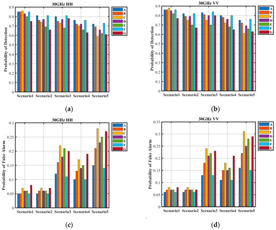 Detection performance of four classifiers. (a) Detection probabilities under HH polarization. (b) Detection probabilities under VV polarization. (c) False alarm probabilities under HH polarization. (d) False alarm probabilities under VV polarization.