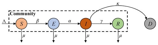 In Figure 1, S, E, I, R, and D represent the susceptible, exposed, infected, recovered, and deceased compartments, respectively; Λ denotes the number of natural births; α and β denote the infection growth rate (i.e., the inverse of the incubation period) and infection rate; γ denotes the recovery rate from infection to recovery (i.e., the product of the inverses of the recovery time and the population ratio); and μ and κ denote the death rates related to natural causes and infection, respectively. Additionally, the deceased compartment is a terminal state that does not influence the virus transmission process apart from natural deaths and is therefore considered outside of community dynamics. Based on this framework, the SEIRD model can be formulated as the following set of differential equations: