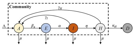 where A, E, I, H, and D denote the antibody-acquired, exposed, infected, hospitalised, and deceased compartments; βA denotes the antibody-acquired infection rate of antibody-acquired individuals; η denotes the severe symptomatic rate; γI and γH represent the recovery rates from the infected and hospitalised compartments, respectively; and κH represents the deceased rate from the hospitalised compartment. Notably, introducing a natural birth rate into the A compartment inevitably results in the inclusion of individuals who have neither been vaccinated nor acquired immunity through infection. However, the number of such individuals is relatively small, and introducing a separate susceptible compartment for them would significantly increase the model’s complexity without substantially affecting the overall epidemic dynamics. Moreover, considering both natural births and deaths is essential for maintaining the mathematical stability of the population structure. Assigning newborns directly to the A compartment serves as a reasonable approximation in the context of the post-COVID-19 era. The active total population in the community always satisfies the following condition: