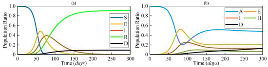 The population ratios of each compartment based on (a) SEIRD and (b) AEIHD.