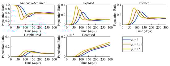 The population ratios of all compartments of the AEIHD model at three different antibody-acquired infection rates (βA = 0.75, βA = 1, and βA = 1.5).