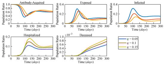 The population ratios of all compartments of the AEIHD model at three different severe symptomatic rates (η = 0.05, η = 0.1, and η = 0.15).