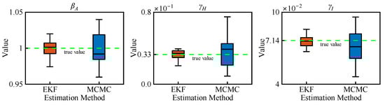 Figure 6 illustrates the parameter estimation results by MCMC with 3000 samples and EKF over 300 days, with reference to their true values given in Table 1. It is obvious that the EKF estimation of the model parameters closely aligns with the reference while demonstrating higher precision compared to MCMC estimates, which exhibit greater variability around the true values. The RMSEs of the EKF estimates are about 0.0034, 0.0027, and 0.0025 for parameters βA, γI, and γH, respectively, as shown in Table 2. However, the RMSEs obtained using MCMC are about twice as large as those of EKF. Therefore, it is evident that the suggested EKF based on the AEIHD model can effectively estimate the model parameters.
