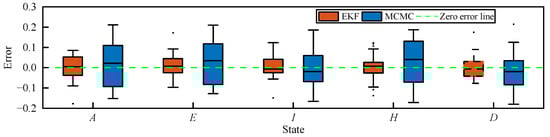 Figure 7 presents the estimation errors of the transmission states of MCMC and EKF methods based on the AEIHD model. It is clear that the EKF estimations of all compartments closely approximate their true values. The RMSEs of all compartments obtained by EKF are 4.1%, 3.2%, 3.8%, 2.9%, and 3.9%, as indicated in Table 3, which are approximately two to three times lower than those of MCMC. Therefore, the suggested EKF based upon the AEIHD model can effectively estimate the transmission state and model parameters.