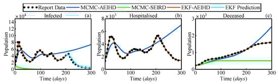 Estimated transmission states by MCMC-SEIRD, MCMC-AEIHD, and proposed EKF-AEIHD: (a) infected population: 200-day estimation and 100-day prediction, (b) hospitalised population, and (c) deceased population.