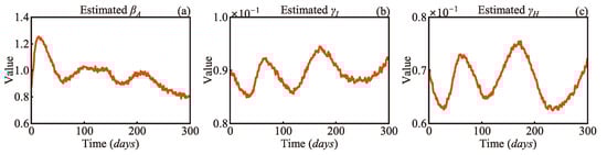 To evaluate the EKF estimation performance based on the proposed AEIHD model, observational data were produced by introducing random Gaussian noise with the covariance Q = 0.01 into the AEIHD model’s numerical solution, as shown in Figure 3b, to mimic the actual reported data on COVID-19. The initial values for the transmission state and parameters are the same as those of the previous simulation.