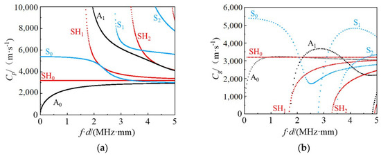 The materials used for both the tank bottom plate and wall plate are Q235 carbon steel, with an elastic modulus of 208 GPa, a density of 7850 kg/m3, and a Poisson’s ratio of 0.3. By employing the wave finite element method, the dispersion curves of guided waves in the tank bottom plate and wall plate structure were calculated. The results are shown in Figure 4 below: