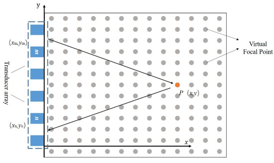 Taking the array inspection of the tank bottom as an example, consider a single propagation path involving an excitation element (xm, ym), a reception element (xn, yn), and a damage point P (x, y). The time-of-flight T (x, y) along the propagation path is calculated based on their geometric relationship.