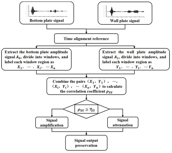 where represents the processed amplitude signal of the tank bottom plate in the current window, in volts (V); denotes the raw amplitude signal of the tank bottom plate in the current window, in volts (V); is the correlation coefficient in the current window; is the correlation processing threshold.