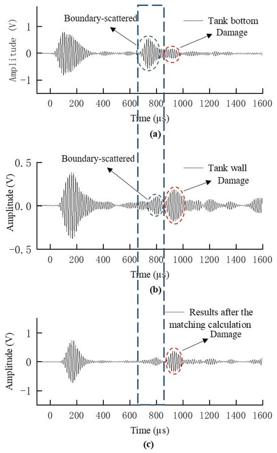 As shown in Figure 8 above, the time-domain detection signals of the storage tank bottom plate, wall plate, and the bottom plate after correlation matching processing are displayed. From Figure 8a,b, it can be observed that the damage echo signals on the bottom plate and wall plate, due to the non-dispersive nature of the SH0 mode guided waves, exhibit consistent time-of-flight when propagating the same distance to the bottom plate and wall plate. In contrast, the boundary-scattered S0 mode guided waves propagate partially along the bottom plate and are received by the bottom plate array, while the other portion propagates along the wall plate and is received by the wall plate array. Due to the difference in thickness between the bottom plate and the wall plate, the frequency-thickness product of the guided waves changes along different propagation paths, leading to variations in the group velocity of the boundary-reflected guided waves on the bottom plate and wall plate. Because of the differences in propagation paths and velocities of the boundary-scattered signals, the echo signals of the boundary scattering gradually diverge in the time domain between the bottom plate and the wall plate. The correlation between the boundary-scattered echo signals received by the bottom plate array and those received by the wall plate array progressively decreases. The results after correlation matching calculations are shown in Figure 8c, where the damage echo signals are well preserved, while the boundary-scattered echo signals are effectively attenuated.