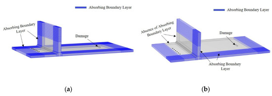 This subsection investigates the influence of side-connection weld scattering signals on damage detection in storage tank bottom plates by modifying the absorbing boundary layer configuration in the finite element model. The ABLs adopt a multi-tiered configuration based on mesh gradation, with a total length and maximum absorption parameter . To mitigate acoustic impedance discontinuities, the thickness of the damping layers progressively increases from the inner to outer regions. The governing equations are provided in Equation (8).