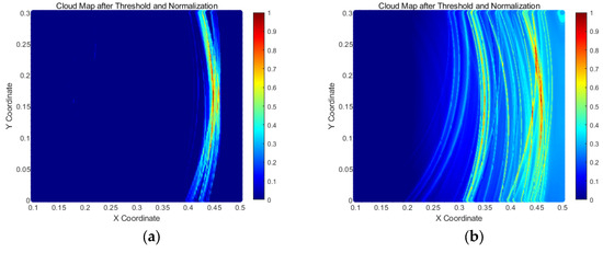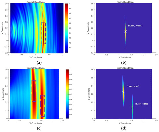 The imaging results of the collaborative bottom plate-wall plate detection are shown in Figure 15. The left-side images (a), (c), and (e) in Figure 15 represent the original imaging cloud maps of the collaborative detection results. To ensure the clarity and accuracy of damage identification, the pixel grayscale values in the left-side cloud maps that were less than 0.8 were set to zero, and the resulting damage localization cloud maps are shown in Figure 15b,d,f.
