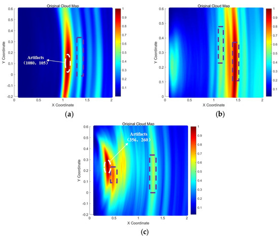 TFM cloud maps from bottom plate array detection. (a) Bottom plate array results for (1330, 120); (b) Bottom plate array results for (1130, 250) and (1530, 150); (c) Bottom plate array results for (460, 200) and (1070, 150).