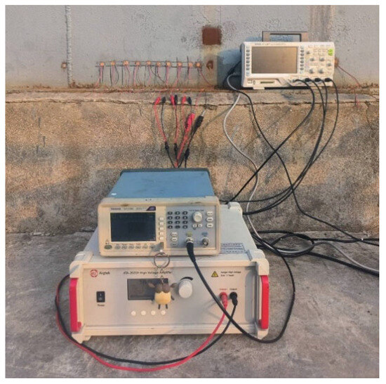 The “T”-shaped structure in the experimental setup represents a 100,000-cubic-meter tank bottom model. Both the bottom plate and wall plate are made of Q235 structural carbon steel. The thickness of the bottom plate is 20 mm, while the wall plate has a thickness of 30 mm. The length of the edge plate on the outer side of the tank is 120 mm, and the overall width of the bottom plate is 3 m. The specific experimental platform is shown in Figure 5. In this study, the signal generator used is a Tektronix AFG1062 function generator (Tektronix, Beaverton, OR, USA), which is capable of effectively generating sine waves, square waves, and arbitrary waveforms. During the experiment, the guided wave signal excited is a five-cycle Hanning window-modulated sine wave with a center frequency of 65 kHz. The specific modulation method is shown in Equation (1). The signal amplifier is an ATA-2021H (Aigtek, Xi’an, China), with a controllable voltage gain of up to 60 times and a maximum output voltage of 200 V. The oscilloscope is a RIGOL DS1104 (RIGOL, Suzhou, China), which supports multi-channel data acquisition with a maximum real-time sampling rate of 1 GSa/s in full-channel mode. In this experiment, the sampling rate of the oscilloscope is set to 12.5 MSa/s. The transducers used are d15-type 10 × 10 × 3 mm piezoelectric shear plates, which can effectively excite SH0 mode guided waves when excited perpendicular to the polarization direction of the transducer. The coupling agent used is a metal adhesive, which exhibits excellent compatibility between ceramics and metals. Additionally, it possesses fast-drying properties, allowing for rapid and high-strength coupling of the transducer with the wall plate.