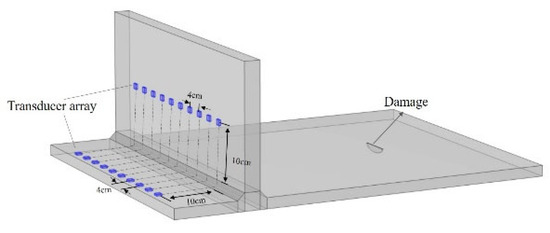 In the detection of damage behind the “T”-shaped structure of the storage tank bottom plate, to simulate the actual online inspection process as closely as possible, neither the excitation transducer nor the receiving sensors can be placed inside the tank. The damage detection experiment was conducted by arranging a transducer array on the outer edge plate of the tank. Each array consists of ten transducers, positioned 100 mm from the large fillet weld, with a center-to-center spacing of 40 mm between each transducer element.