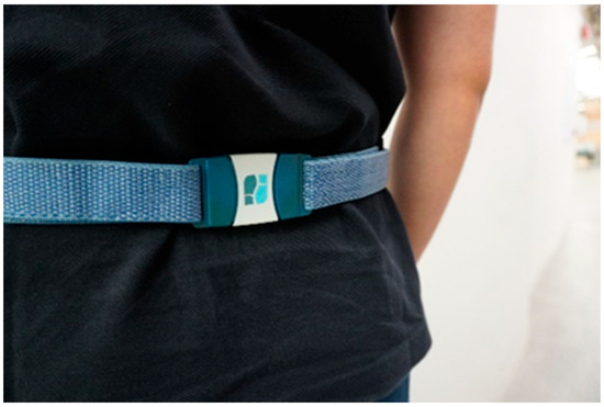 The Sensor System is a waist-belt-like wearable developed to provide feedback information regarding mobility and balance to the individual. It is 4 cm × 5.5 cm × 1.2 cm, with built-in accelerometers and gyroscopes (Figure 1 and Figure 2), and must be fastened with an elastic waist belt in a position over the L5 vertebra (lower back). This position ensures unobtrusive and precise data collection, capturing the intricate dynamics of posture and movement with a high sampling rate of 100 Hz [24]. The Sensor System utilizes a proprietary algorithm to evaluate key fall risk parameters, including balance, gait characteristics, and walking speed [17]. The device records kinematic movement data while participants perform standardized functional assessments. These data points are transmitted via Bluetooth to a tablet-based interface, where real-time analysis generates fall risk classification reports [17]. The output of the system categorizes participants into moderate- or high-risk groups based on predefined thresholds. However, the algorithm’s underlying methodology remains proprietary and was not disclosed by the manufacturer, limiting the ability to independently validate its computational approach. A recent study investigated the use of the Sensor in fall risk assessment of older adults. The results found that the Sensor has good test-retest reliability and internal consistency; however, it might not be sensitive to identify non-fallers and recurrent fallers retrospectively [17]. Therefore, the Sensor’s clinical effects in predicting prospective fall occurrences remain uncertain. This study aimed to assess its predictive validity by correlating sensor-classified risk levels with observed prospective fall incidents over 12 months.