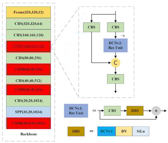 As illustrated in Figure 2, the CSPDLayer of RE-YOLOv5 comprises a combination of a CBS component and a DCNv2-Residual Unit. The CBS’s convolutional layers, all featuring 1 × 1 convolutional kernels, primarily control the channel relationships between layers. Meanwhile, the DCNv2-Res Unit, serving as the smallest residual unit within the CSPDLayer, is obtained by cascading a CBS with a Direction-wise Batch Splitting (DBS) and then connecting the residuals. In this structure, the DCNv2 within the DBS is of size 3 × 3. This size is chosen because it provides a sufficient receptive field, making it well suited for feature extraction in the backbone network.