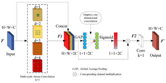 the second part uses the Efficient Channel Attention (ECA) [27] mechanism to enhance the feature map channel correlations in the first part and suppress useless channel information to some extent. ECA first compresses the feature map in the spatial dimension using global average pooling (GAP), obtaining a set of feature information related to the channel dimension. Then, adaptive one-dimensional convolution with convolution kernel size k is used to generate the channel weights, which are channel-weighted to the input feature map after Sigmoid normalization. Assuming that the output feature map of the above process is , it can be described as shown in Equation (3).