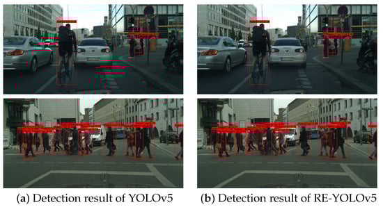Figure 6 shows a comparison of the actual detection results on the CityPersons test set. In the detection scenario in the first row, there is an obscured pedestrian behind the pram that is not detected, whereas in figure (b), it can be seen that RE-YOLOv5 can be detected; in the second row of the comparison results, there is an obscured pedestrian on the left side that is not detected by YOLOv5, but it can be detected by RE-YOLOv5. Comparing the two results, we can see that RE-YOLOv5 is better at overall detection.