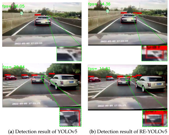 To further validate the real-world occlusion detection performance and hardware compatibility of RE-YOLOv5, we conducted practical testing using dashcam video data. The experiments leveraged the KITTI-trained model deployed on a system with NVIDIA GeForce RTX 2060 (12 GB VRAM) and Intel® Core™ i5-10400F CPU @ 2.90 GHz. The video data were also sourced from publicly available internet repositories with two randomly selected frames undergoing comparative detection analysis. The results are shown in Figure 7, and it can be seen that the FPS of RE-YOLOv5 is also reduced compared to YOLOv5 detection because deformable convolution increases the inference time, but it is better than YOLOv5 for occluded object detection in real driving scenarios.