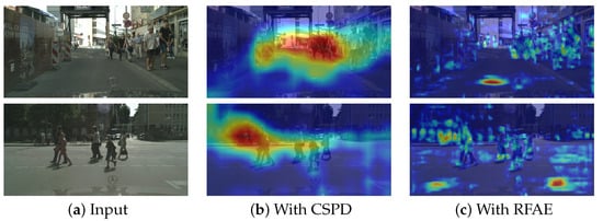 To visually evaluate the effectiveness of CSPD and RFAE modules, we present feature heatmap visualizations of their outputs on the CityPersons dataset in Figure 8, which includes three columns: (a) input images, (b) CSPD output heatmaps, and (c) RFAE output heatmaps. The visualization reveals strong activations (red regions) in densely occluded object areas, while moderate background responses (yellow regions) indicate a computational trade-off inherent to contextual feature extraction.