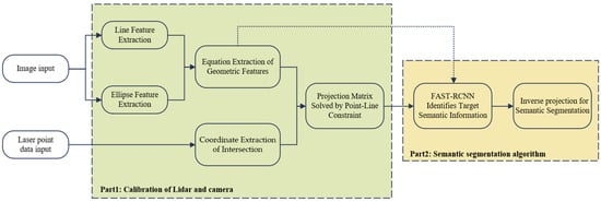 In order to improve the adaptability and operation of the LiDAR and camera calibration methods, and to reduce the amount of calculation given by the laser point cloud semantics and improve its real-time performance, the algorithm as shown in Figure 1 is proposed.