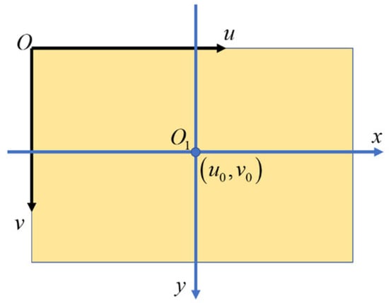 Since the image plane of the camera is a 2D plane, as shown in Figure 2, the coordinates of points on the image can be expressed as , which is the image coordinates in pixel units with the origin of the vertex on the upper-left corner of the image, and the physical coordinates of pixels can be expressed as . The pixel coordinate of the optical center of the camera is . If the physical dimensions of the pixel are and , respectively, the following equation is given: