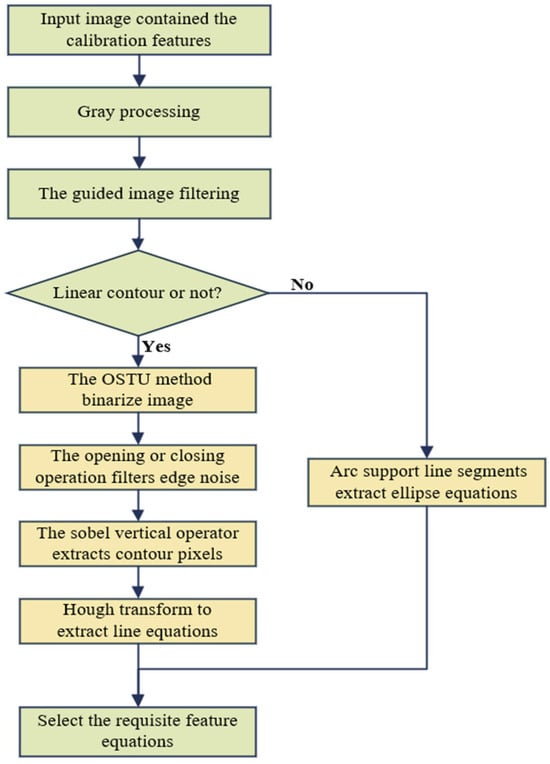 From the framework of the LiDAR and camera semantic fusion algorithm in Section 3, it is clear that accurately obtaining the contour of the target in the image and its corresponding equation is essential to the calibration process. However, accurately extracting the contour is challenging due to various environmental noises and inherent limitations in camera design. To mitigate the impact of environmental and electronic noise on feature extraction, we developed the image processing workflow, as illustrated in Figure 3.