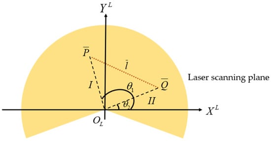 Due to the limitations of LiDAR design principle, the collected data are sparse and have a certain amount of noise, and the laser points formed near the intersection line cannot form a straight line. In order to obtain the line equation of the intersection line in the LiDAR coordinate system, the fitted line is obtained by fitting the laser points near the intersecting line through the least square method. The angle values and returned by I and II are used to construct line and line to cross-fit line to point and point , respectively, as shown in Figure 4. Through this method, the coordinate values of the two points , , , and can be calculated.