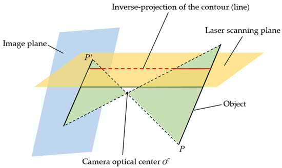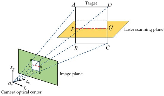At this time, we consider the imaging relationship between the LiDAR scanning plane and the camera image plane, as shown in Figure 7. For the linear target, in the case of the limited distance of the camera to the light source, the target appears as a line on the image plane. Considering the principle of projective geometry as described above, the green area in Figure 7 is the projection of the target plane to the set of the camera optical center, and the image of the target on the image plane is obtained by combining the camera image plane with the set of the camera optical center. If expressed in mathematical language, the target can be seen as a large number of points, take one point , and the line is a line in the set of determined by the point on the target plane; this constitutes a mapping, ; and the point is the preimage of the line under the projection. is a point in the camera image plane determined by truncating a line in the set of ; this constitutes another mapping, ; and point is the image of line under the intercept. Then, the process of central projection can be expressed as follows: