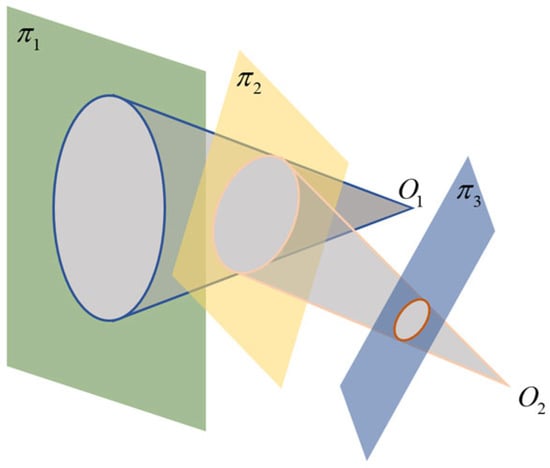 A projective map is a map through a finite number of central projections such that the projective plane becomes the projective plane . It can keep the collinearity of projective space (plane, line) and the intersection ratio of four collinear points constant. As shown in Figure 6, we project the circular curve on the plane through the center of the point light source . Through the projective map, , we can obtain the ellipse on the plane . The ellipse on the plane is then obtained by projecting it through the center of . In this process, a projective mapping relationship is determined, namely, . According to the properties of projective mapping, when there is a correspondence relationship between four points, only the transformation matrix can be obtained to satisfy the projective mapping relationship, and the projective mapping of the two faces is invertible.