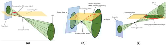 The target plane forms a central projection on the laser scanning plane through the family of camera optical center . As the object transitions from below to above the camera’s centerline, the inverse projected curve transitions from an ellipse to a hyperbola and back to an ellipse, while the conic curve’s center, derived from the circular object’s contour via inverse projection, travels from the point at infinity to the camera’s optical center and back to infinity. As can be seen from Figure 8a, the contour of the object on the image plane is projected as an ellipse through the center of the camera, and the center projection on the laser scanning plane is an ellipse. While the circular object moves, the center projection on the laser scanning plane becomes a hyperbola, as shown in Figure 8b. It is also possible to form an ellipse on the laser scanning plane when the object moves above the horizontal line of the camera’s optical center, as shown in Figure 8c.