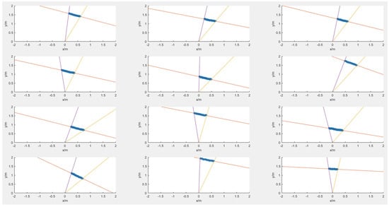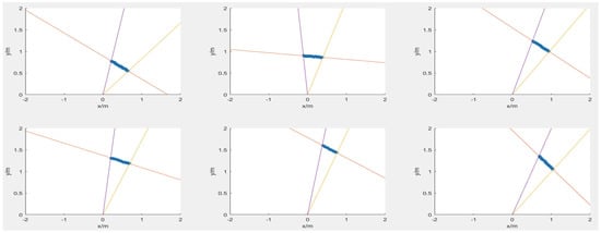 Suppose we collect N sets of data, and since each set of data has two sets of point-line geometric constraints, we collected 2N sets of point-line correspondences. For the i-th group of point-line constraints, if the coordinate of the intersection point detected in the LiDAR coordinate system is , the corresponding boundary or can be captured on the image. For the line boundary , the point coordinates are put into Equation (8) as follows: