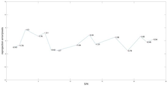 After obtaining the above data, we take the optimized projection matrix as the initial value and put it into Equation (15), when , and use the Levenberg–Marquardt algorithm to solve the problem. Align the first term of the obtained result with the initial value. The projection matrix is obtained as follows: