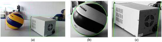 The results of image recognition and boundary extraction. (a) Results of image recognition: the red bounding box indicates the ball, while the green bounding box indicates the instrument. (b) Results of elliptic boundary extraction: the green ellipse represents the boundary of the ball. (c) Results of linear boundary extraction: the green lines represent the boundaries of the instrument.