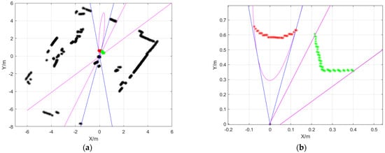 The projection matrix of LiDAR and the camera was used to inverse-project the object contour to the laser scanning plane, and the angle range of the two straight line boundaries was calculated as , and the angle range of the two ellipse tangent lines crossing the origin was . The angle segmentation was used through the algorithm in Section 5 to obtain that the laser beam hitting the instrument was , and the laser beam hitting the sphere was . As shown in Figure 18, the magenta lines are the lines obtained by inverse-projecting the object contour to the laser scanning plane, and the blue lines are the tangent lines of the ellipse at the origin. The red point set is the target point cloud group obtained by the LiDAR hitting the sphere, and the green point set is the target point cloud group obtained by hitting the instrument.