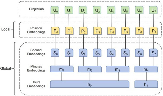 In addition to local time stamps information, hierarchical time stamp information, such as specific hours, minutes, and seconds, is sometimes required [34]. The Informer model uses adaptive input embedding to capture the time series data’s temporal features and has a three-layer feature input representation, as shown in Figure 2.