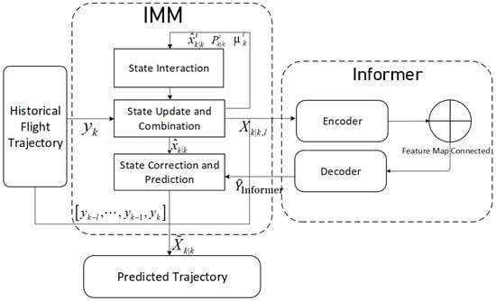 The proposed hybrid trajectory prediction method combines the IMM and Informer model advantages. To perform the trajectory predictions with changing dynamics, we implement the initial estimates utilizing the IMM algorithm that fuses multiple classical motions. When dealing with sequential flight track data with an unknown model, it is common to use sequence-to-sequence architecture to augment the time series links for the predictions. The informer encoder stage synchronously embeds the spatial state and temporal features to capture the deeper target change patterns in the time series. The ProbSparse self-attention mechanism is crucial for extracting the sequential implicit relationships as it assists the decoder in preserving the temporal dependencies by generating predictions, which further enhances the ability of the long-time-dependent features to characterize the trajectories. IMM is exploited to the multi-model state estimation, which is suitable for scenarios that require switching between different motion modes, and the Informer model is a sequence prediction model based on the ProbSparse self-attention mechanism and self-attention distilling that can deal with long-term time-series dependencies effectively. Therefore, by fusing the informer error outputs with the initial IMM’s multi-model estimation, highly temporal and fine-grained trajectory predictions can be realized. The IMM and Informer combination is used throughout the trajectory prediction process as the two work together for the state estimation and the prediction correction based on time series feature extraction, as shown in Figure 3.