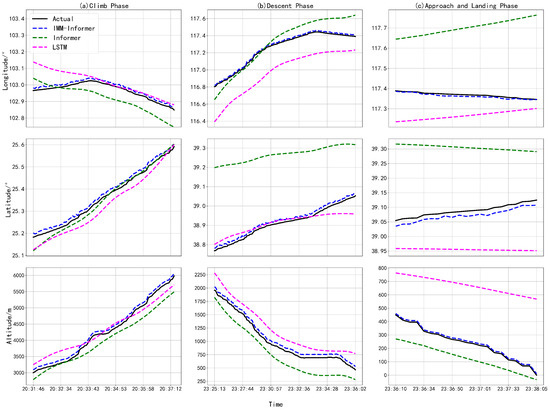 To test the prediction validity of the proposed algorithm, the typical data-driven time series prediction deep learning model is used for comparison. LSTM is a special recurrent neural network that addresses gradient vanishing and explosion problems through the introduction of gating mechanisms, enabling it to capture long-term dependencies in sequences. Informer, like the Transformer, employs self-attention mechanisms and parallel computation to capture global dependencies in sequences. Unlike LSTM’s autoregressive generation requiring iterative steps, Informer processes entire sequences as a whole. Informer is more efficient than the traditional Transformer for the LSTF tasks due to its ProbSparse self-attention mechanism and self-attention distilling mechanisms. Since LSTM and Informer are representative, they are chosen for comparison with the proposed method. Both models are characterized by their respective longitudes, latitudes, altitudes, and corresponding times, with the other hyper-parameters set similarly to the IMM-Informer model. All the models were trained on the ADS-B data for the same flight. The randomly selected 24 days of the receiving data are the training set, the remaining 4 days are the validation set, and the last 2 days are the test set. The predicted aircraft trajectories in the three flight climb, descent, approach and landing phases are shown on the time axis in Figure 4a–c for longitude, latitude, and altitude.