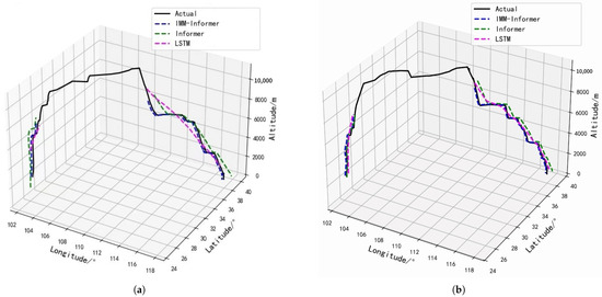 In this experiment, complete trajectories are used to compare the latitude, longitude, and altitude prediction effects in the different phases with different flights; the results are given in Figure 5a,b. From the overall 3D trajectory prediction comparisons, the IMM-Informer and LSTM models predict trajectories that are the closest to the actual trajectories, followed by the Informer model. Then, based on the comparison of the actual trajectories and the analysis of the three MAE, RMSE, and MAPE evaluation indexes, we compare the integrated error value metrics in Table 3.
