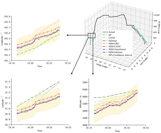 As can be seen from Figure 6, taking the climbing stage as an example, the confidence intervals of the proposed method contains the real trajectory, and the hybrid methods using multi-model information are superior to the single data-driven method and the traditional Kalman filtering, although the Kalman filtering also uses the motion model. The reason lies in that a single model cannot effectively represent the dynamic changes or uncertainties existing in the flight process. In the hybrid prediction methods, IMM fused with LSTM and GRU, which are based on recurrent neural network architecture, have a similar prediction performance, but the overall performances are lower than the hybrid method based on Transformer architecture because the latter utilizes the self-attention mechanism to capture the sequence dependence. In addition, compared with the proposed IMM-Informer, the prediction performance of IMM-Transformer fluctuates at some points. The reason may lie in the global attention mechanism of the Transformer being more sensitive to local dependence. Also, there are many variants of the Transformer structure for specific tasks, and Informer achieves an effective balance between longer sequence predictions and local dependencies. Actually, the proposed hybrid method combined with dynamic modeling and being data-driven can be viewed as knowledge embedding on the flight surveillance data, and the algorithm fusion is conducted based on the sensor surveillance data. In order to represent more complex environments, such as complex weather, routes, sensor anomalies and packets loss, more prior knowledge is needed to build models for interaction, and the models selected and the construction of the general model will be another type of challenge.