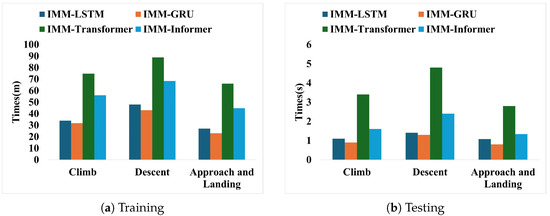 To discuss the feasibility of deploying the proposed method in actual ATC systems, the efficiency comparison of the hybrid methods with different flight trajectory prediction phases is presented. We evaluate model efficiency concerning both training and testing times. The efficiency comparison results are given in Figure 7.