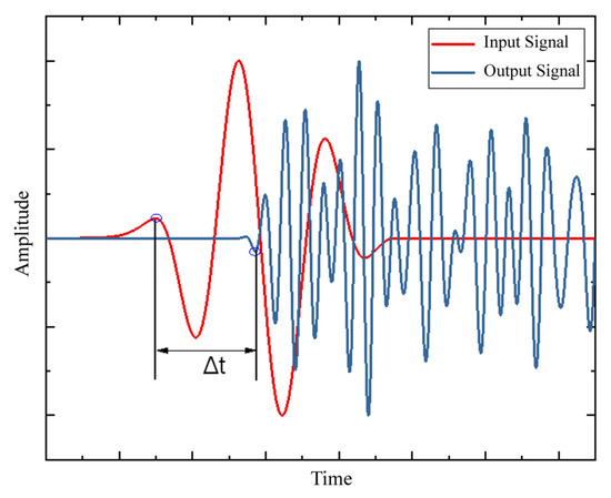 In practical engineering applications, the elastic modulus and Poisson’s ratio of structural components may differ from those of standard concrete, and obtaining the actual values of these parameters can be complex. Therefore, the P-wave speed calculated using Equation (1) may differ from the actual wave speed in the specimen. In practical operations, the wave speed can be calculated based on the time difference between the output and input signals, as shown in Figure 1.